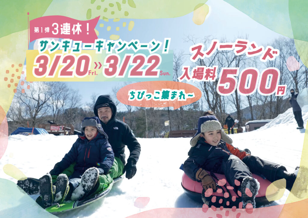 3月20日~22日の3連休は、スノーランドの入場料が500円でご利用いただけます!